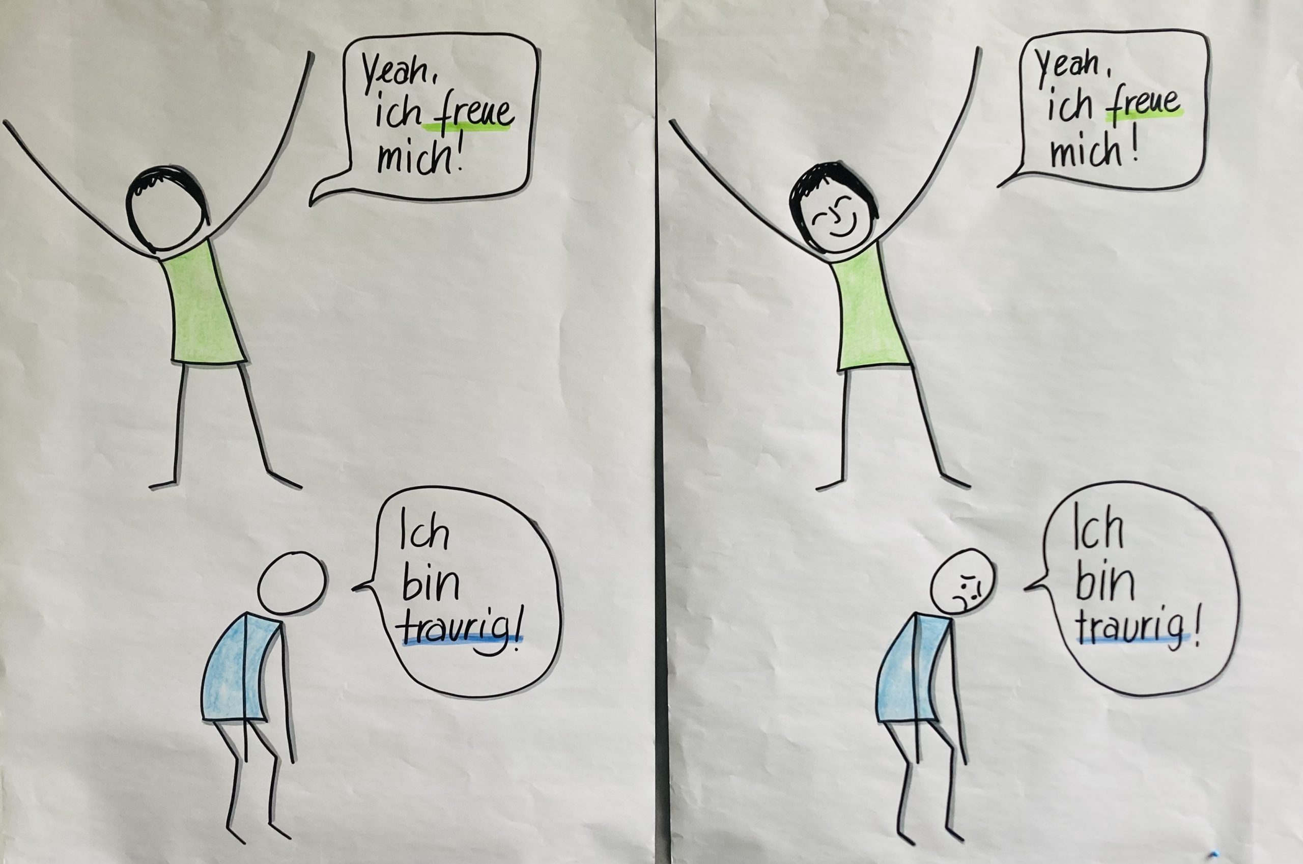 Probiere es aus: Zeichne eine Figur mit neutralem Gesichtsausdruck – und dann eine mit Emotion. Wie verändert sich die Wirkung? Oder skizziere deine aktuelle Stimmung – das hilft, Gefühle bewusster wahrzunehmen und ihnen Raum zu geben.